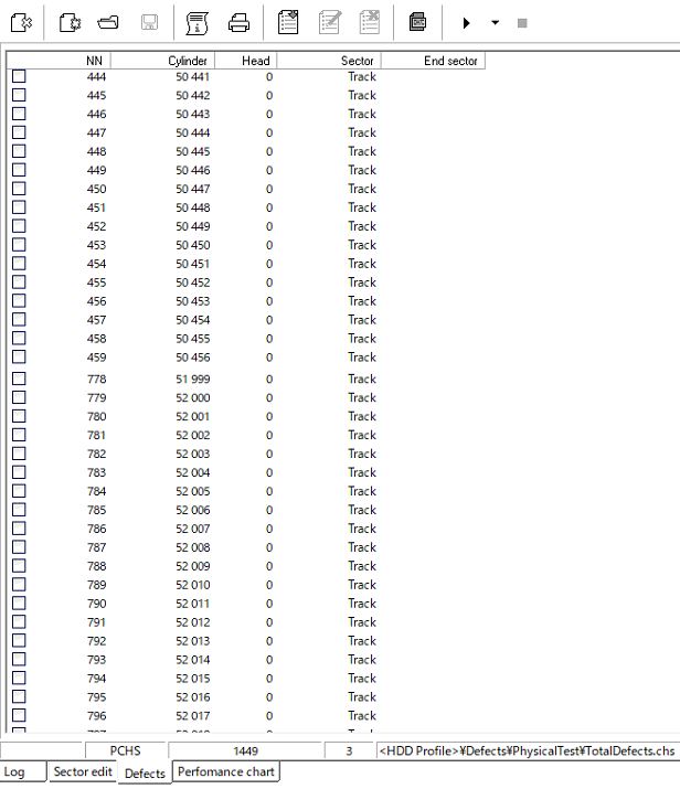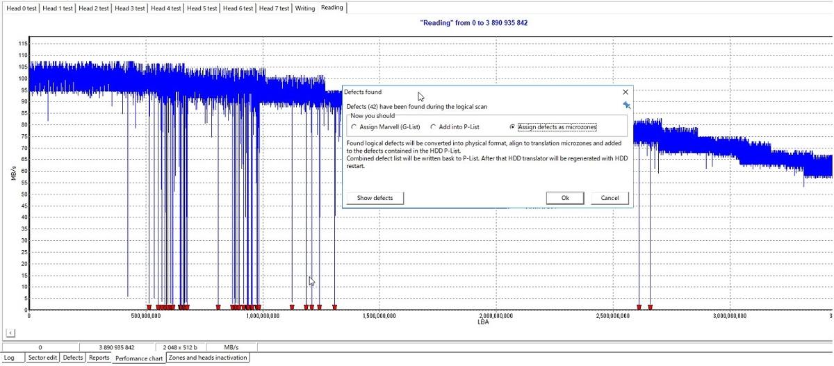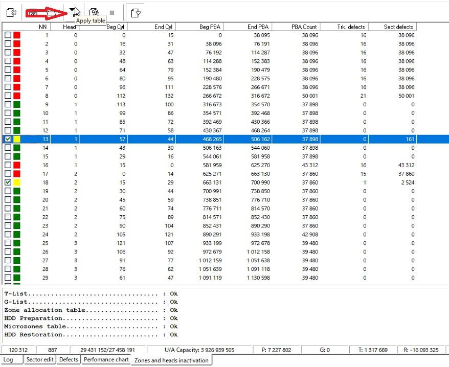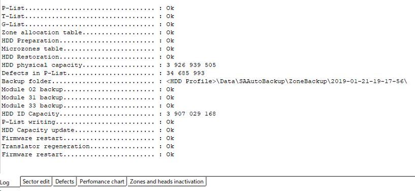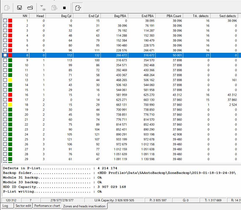 首先,我们备份所有的服务区域模块,并检查模块32内部的内容(Relo-list,缺陷候选项)。没有那么多的条目,这意味着大多数磁头都是良好的状态: