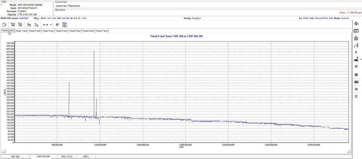 我们得到了WDC WD20EADS-98R6B2 2Tb,它整个表面都有读取问题:该硬盘以全ID开头非常快,能够读取最后一个扇区,但是由于表面不好,很多LBA(包括LBA 0)无法读取 健康)状况很差: